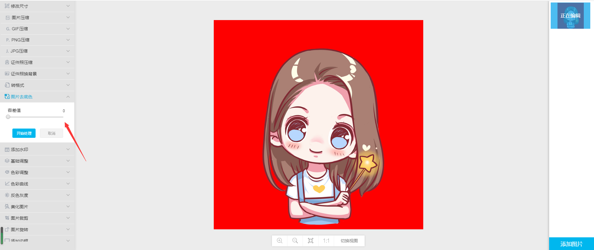 2、点击选择图片按钮上传图片,左侧可以调整容差值,容差值越高处理效果越明显,推荐先使用0处理后看一下效果,再选择是否调整容差值,容差值设置好后点击开始处理。