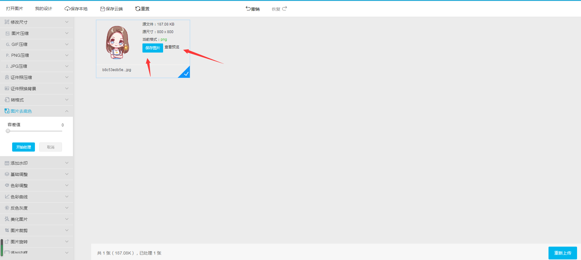3、图片处理完成后如果效果不好可以调整容差值再次点击开始处理,如果没问题就点击保存本地即可将图片保存。