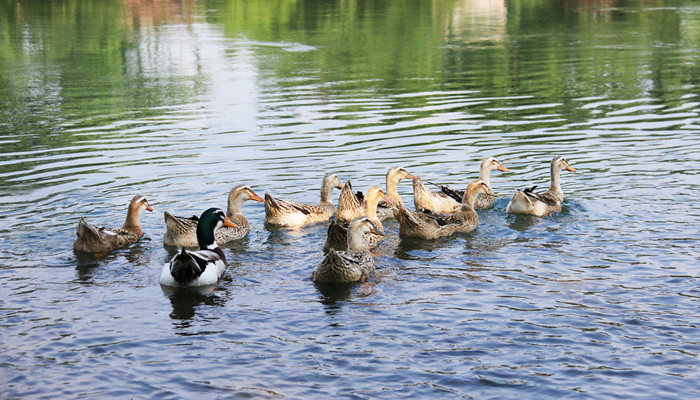 鸭是雁形目鸭科鸭亚科水禽的统称,或称真鸭。鸭的体型相对较小,颈短,一些属的嘴要大些。腿位于身体后方=,因而步态蹒跚。大多数真鸭与天鹅、雁不同,具有下列特征,雄鸟每年换羽两次,雌鸟每窝产卵数亦较多,卵壳光滑,腿上覆盖着相搭的鳞片,叫声则显示出某种程度的性别差异。
