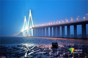 杭州湾跨海大桥是一座横跨中国杭州湾海域的跨海大桥,北起浙江嘉兴海盐郑家埭,南至宁波慈溪水路湾,全长36公里,是世界上最长的跨海大桥,比连接巴林与沙特的法赫德国王大桥还长11公里,成为继美国的庞恰特雷恩湖桥后世界第二长的桥梁。图片署名: 沈志成/IC photo