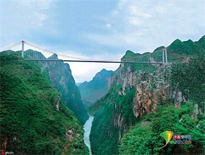 2016年3月14日, 北盘江大桥位于贵州省六盘水市水城县营盘乡境内,从北盘江大小盘江之间河段跨越北盘江大峡谷,两岸地势陡峭,地形变化急剧,起伏很大,河谷深达三百米以上。图片署名: 段长征/IC photo