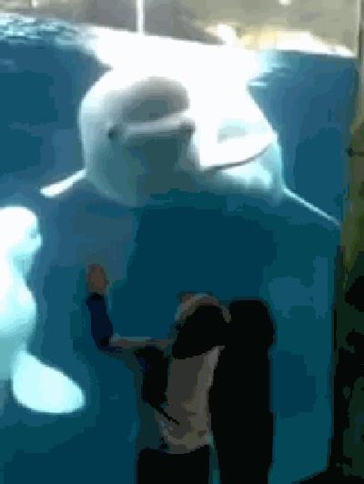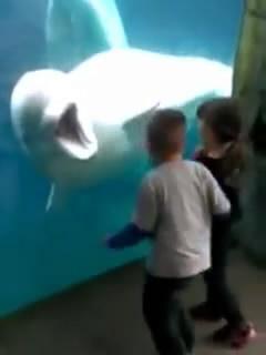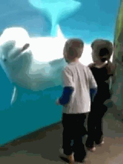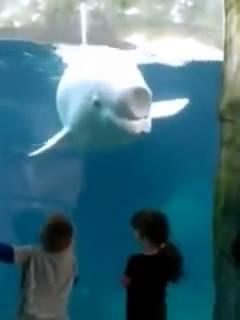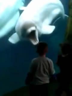 曾有人在美国康涅狄格的水族馆拍摄下一副看似温馨的画面,一条被囚禁在水箱里的白鲸和孩子们做着有趣的互动,它不停的回头张开嘴吓唬逗弄孩子们,这则视频曾在网络上被广泛传播。