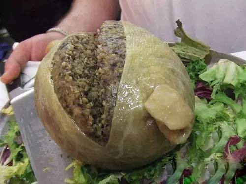 这种食物是把羊的心、肝、下水等等混合洋葱以及各种调味料,放进羊肠子里面做成的,卖相很恐怖。