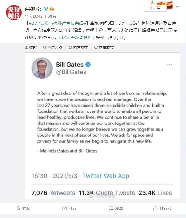 当地时间5月3日,美国微软公司创始人比尔·盖茨在社交媒体上表示将结束与梅琳达·盖茨长达27年的婚姻关系,两人宣布离婚。