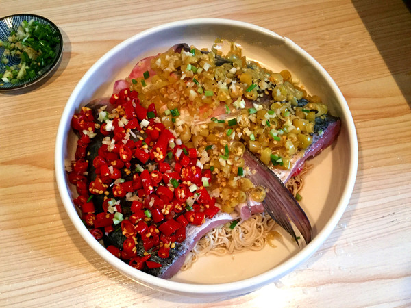 3.葱根部、姜、蒜全部切细,放在碗底(图片有面大家请忽略)葱根部、姜、蒜的量可以多一些。随后把鱼头用清水清洗一遍,把表面的盐冲洗掉。 把鱼放在葱姜蒜上面。 随后把剁椒放在鱼身上。