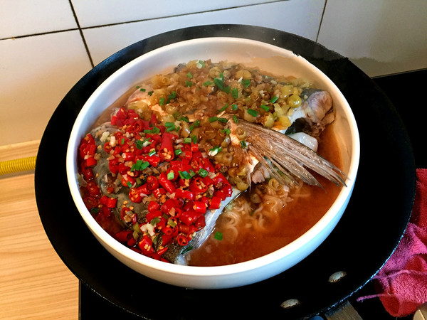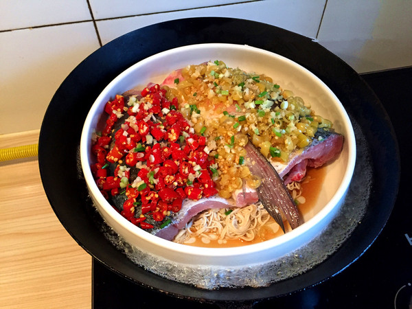 5.750克的鱼头,蒸10分钟关火,打开盖子淋蒸鱼豉油或者生抽,并撒适量葱花,盖上盖子焖3-5分钟,端出淋热油,趁热享用。