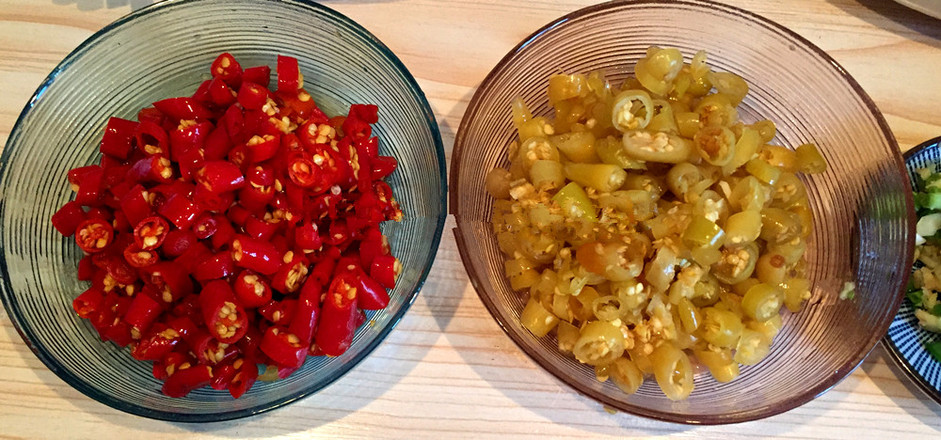 2.剁椒切细,用油、糖、料酒、姜、蒜、葱白,翻炒出香味。