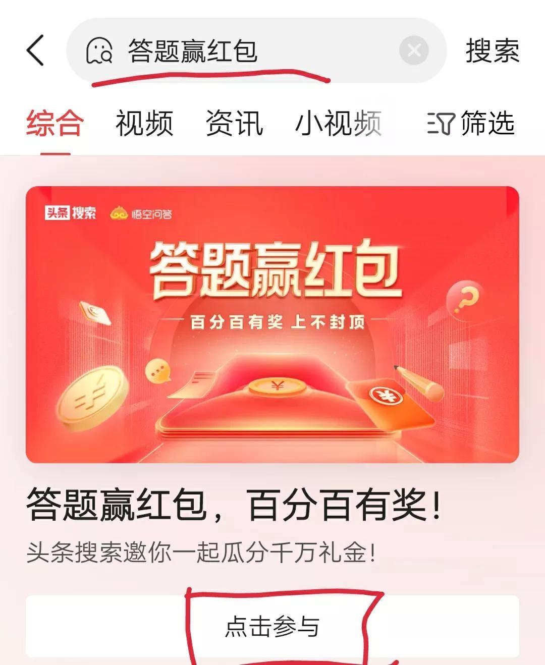 1,在今日头条版上搜索答题赢红包,点击参与。