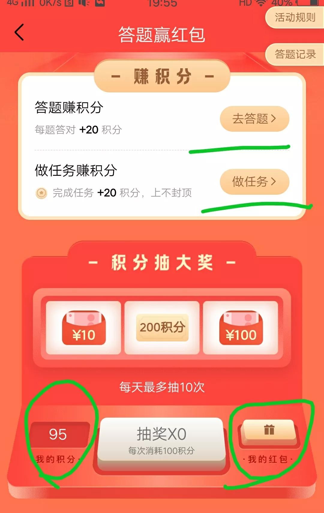 3,日常任务有签到,和十道题,做完可以领到2oo分,抽两次红包。