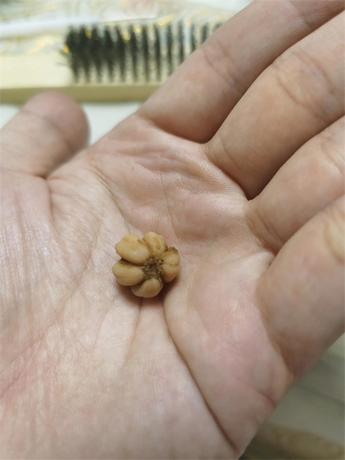 将果肉用钢丝刷去除干净以后阴干两天,比对一下大小进行分类选拔。