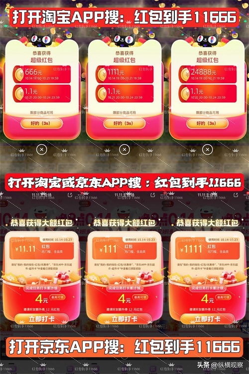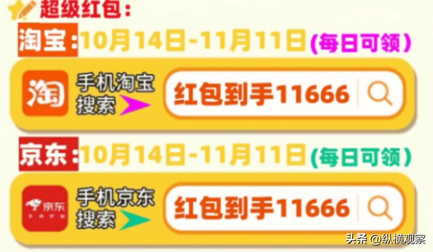 首先,划重点!今年天猫/淘宝和京东的双十一红包口令都是「红包到手11666」要记住!领的红包大小和你搜索的什么口令有关的!这个双平台通用口令包领到大的!记得每天去领!