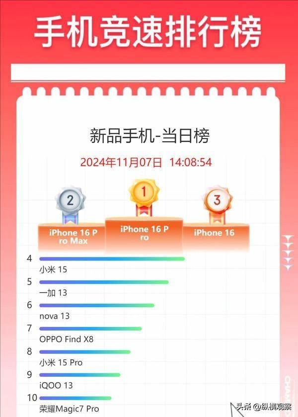 而从11月7日的当日榜(同样截至14点)来看,前三名的机型没有变化,iPhone 16 Pro升至第一,小米15和一加13则升至第四和第五。此外,华为nova 13、OPPO Find X8和荣耀Magic7 Pro等机型也榜上有名。