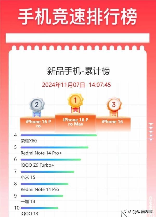 双十一新发布手机销量排行榜公布:小米15升跃第七,iphone16系列霸榜,第一