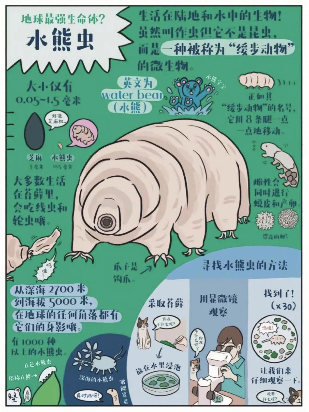 3、在自然界中,在缺水环境下会脱水蜷曲成小桶状,遇水重新舒展,小桶状态下抵抗极端环境的能力超强,是迄今发现的唯一一种可以在真空和太阳辐射双重严酷条件下存活的动物。见下图,水熊虫