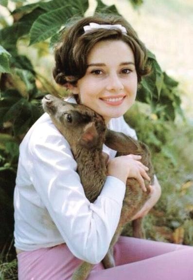 2、身穿白色上衣,粉色裤子的赫本,抱着小鹿的的样子真是可爱,小鹿也非常的听话靠在了赫本的肩膀上。那时候的赫本还非常稚嫩,但是笑容依旧迷人。