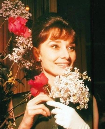 5、就算是不再年轻,也非常优雅的赫本,戴了一只白手套,看上去也是非常的高贵,在花的旁边照相,花都没有赫本美。