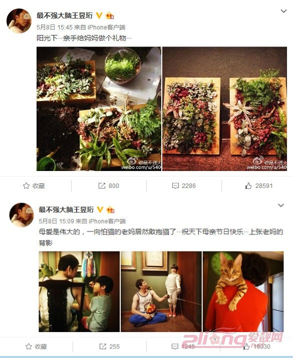 母亲节的当天,一向孝顺的王昱珩亲手为母亲做了两盘独特好看的插花盆栽。郁郁葱葱的植物在王昱珩的巧手下,显得是多么的生动自然有艺术感,没想到平凡无奇的植物也能摇身一变为具有灵魂的艺术品,还在微博中晒出了母亲抱着猫的背影和女儿一起背向而坐的身影,一家和乐融融。可见王昱珩在生活中不仅爱女儿更是一位孝顺的儿子。