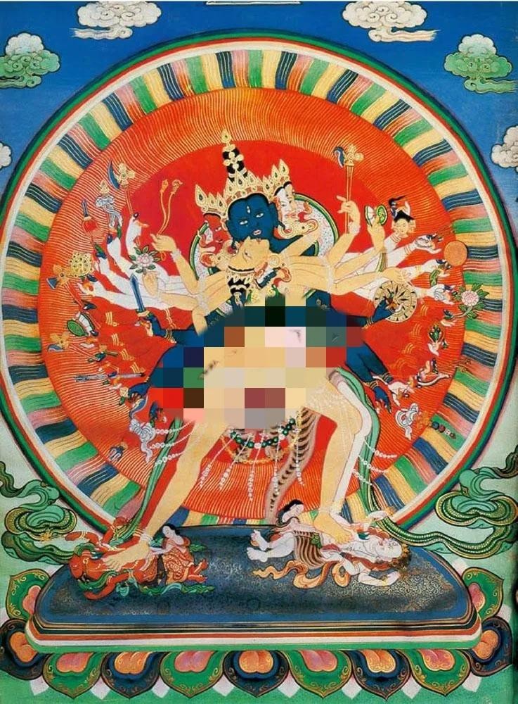 欢喜佛的造型吸收了印度教艺术的一些特色,丰富了佛教艺术。在佛像艺术上,佛教引进了护法神,出现了多头多臂的菩萨像,愤怒凶恶的神佛像。