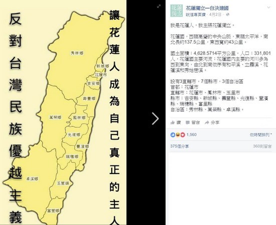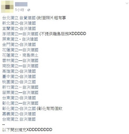 脸书(Facebook)近日出现“花莲独立—自决建国”的粉丝专页,强调“台湾花莲 一边一国”,其它县市群起仿效,据东森新闻网报道,目前脸书网共出现20个“独立建国”专页,18个“独立政权”,只剩基隆和马祖未“宣布独立”。