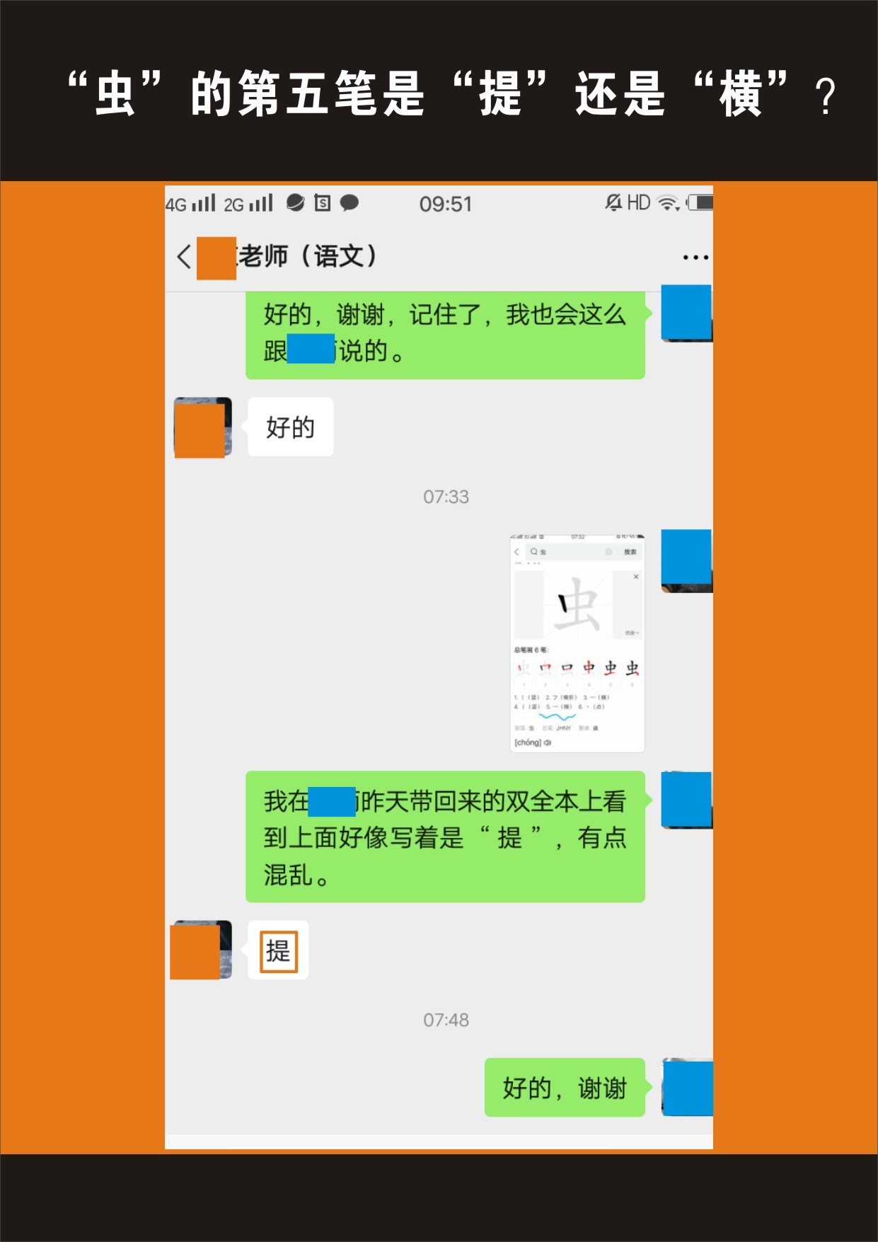 家里的小朋友这几天学到了“虫”,老师也教了书写,一笔一划地写,没什么问题,只是小朋友写的字第五笔更像横,而老师的更像提。
