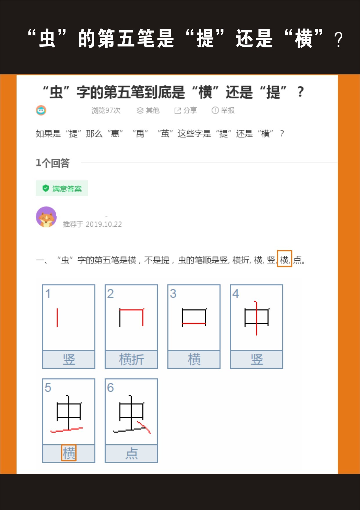 我本人不太懂,平时写“虫”写的也不是很正规,写的字上不了台面,所以我就去网上寻找答案,上网查了之后,我更迷糊了,因为“第五笔是提”、“第五笔是横”的答案都有。