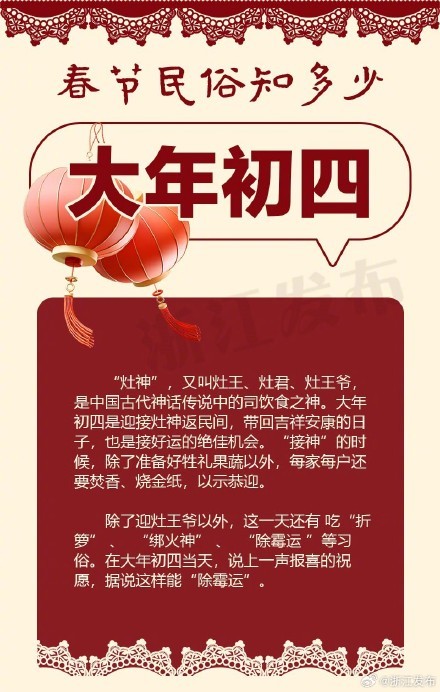 “灶神”又叫灶王、灶君、灶王爷,是中国古代神话传说中的司饮食之神。大年初四,是迎接灶神返民间,带回吉祥安康的日子,也是接好运的绝佳机会,“接神”的时候,除了准备好牲礼果蔬以外,每家每户还要焚香、烧金纸以示恭迎。大年初四当天,说上一声报喜的祝愿,能够除霉运。(新华网)