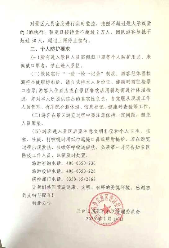 7月15日起五台山景区实行免门票政策,免票时间周一到周五8点到18点,限流人数20000人,周六日实行原票价。