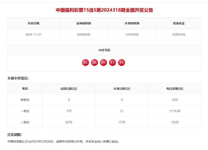 11月27日福彩中奖号码 15选5安徽开出51注一等奖