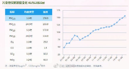 【提醒:目前空气重度污染,实时指数206】最新截至今天(12日)22时,实时空气质量指数为206,重度污染。首要污染物为PM2.5,浓度为156微克/立方米。提醒:儿童、老年人及心脏病、肺病患者应停留在室内,停止户外运动,一般人群减少户外运动。