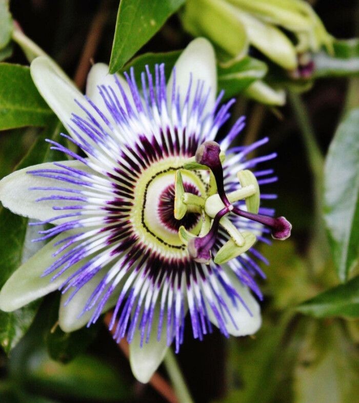 三是聚伞花序退化仅有1花,与卷须对生;花大,淡绿色,直径大,6-8公分;花梗长4公分左右,苞片宽卵形,长3公分,全缘;萼片5个,长4公分左右,外面淡绿色,内面绿白色,外面顶端有1角状附属器;花瓣5个,淡绿色,与萼片等长;外副花冠裂片3轮,丝状,外轮与中轮裂片长1公分左右,顶端天蓝色,中部白色,下部紫红色,内轮裂片丝状,长1毫米左右,顶端有1紫红色头状体,下部淡绿色;内副花冠流苏状,裂片紫红色;有花盘,雄蕊5个,花丝分离,长1公分左右,扁平;花柱3个,分离,紫红色,长1.6公分;5-7月开花;