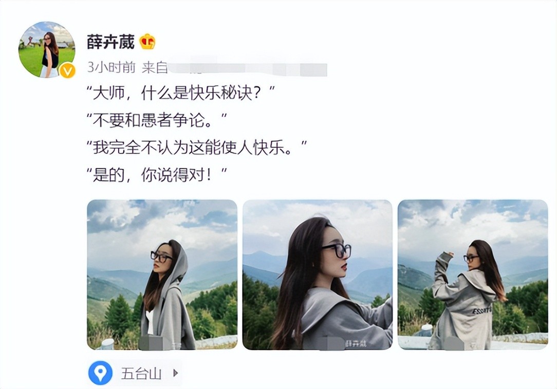 这边经纪公司和网友们议论纷纷,演员薛卉葳本人反倒是一片岁月静好。她虽然没有正面的回应这件事情,但是薛卉葳在社交账号上晒出了一组照片,并且配文表示“不要和愚者争论”。这番言论看起来更像是薛卉葳在内涵造谣者,不过也确实是,任谁遇到这样的事情都很难接受,她没有破口大骂而是选择内涵回应已经算是很克制的了。