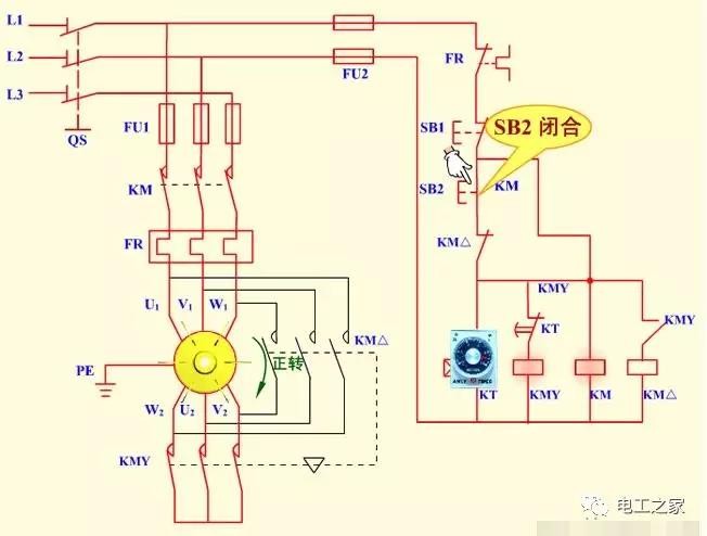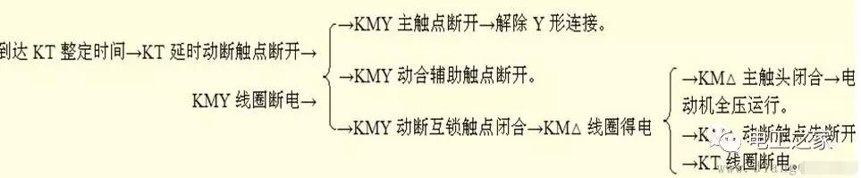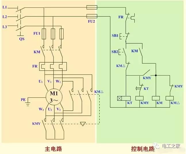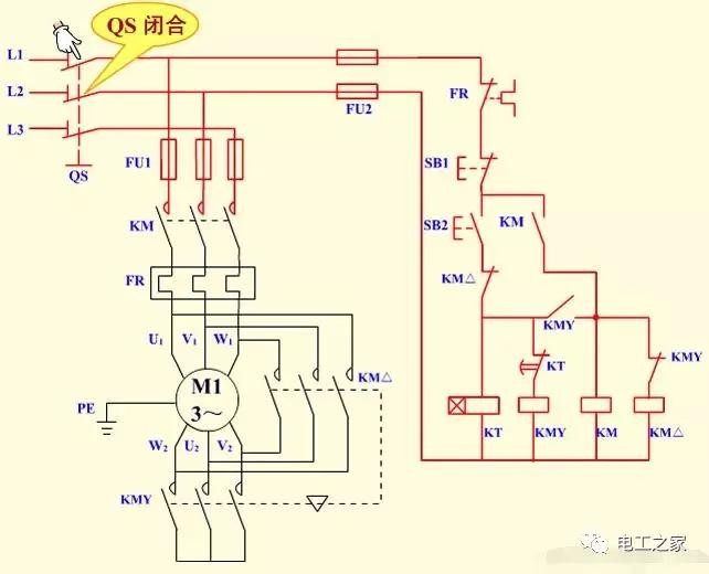 本电路由电源隔离开关 QS;熔断器 FU1、FU2;交流接触器 KM、KMY、KM△;热继电器 FR;时间继电器 KT;启动按钮 SB2;停机按钮 SB1 及电动机 M 组成。