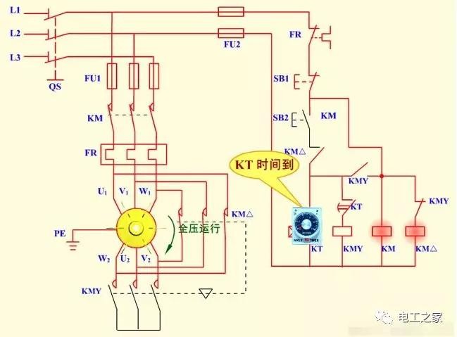 时间继电器自动控制星三角降压启动控制电路原理图解