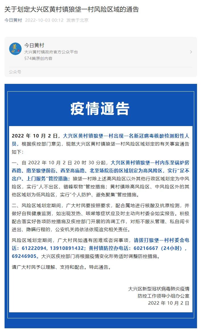 北京大兴区黄村镇发现1例新冠阳性人员,划定高、中风险区
