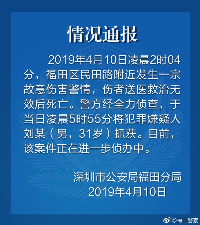 2019年4月10日凌晨2时04分,福田区民田路附近发生一宗故意伤害警情,伤者送医救治无效后死亡。警方经全力侦查,于当日凌晨5时55分将犯罪嫌疑人刘某(男,31岁)抓获。目前,该案件正在进一步侦办中。