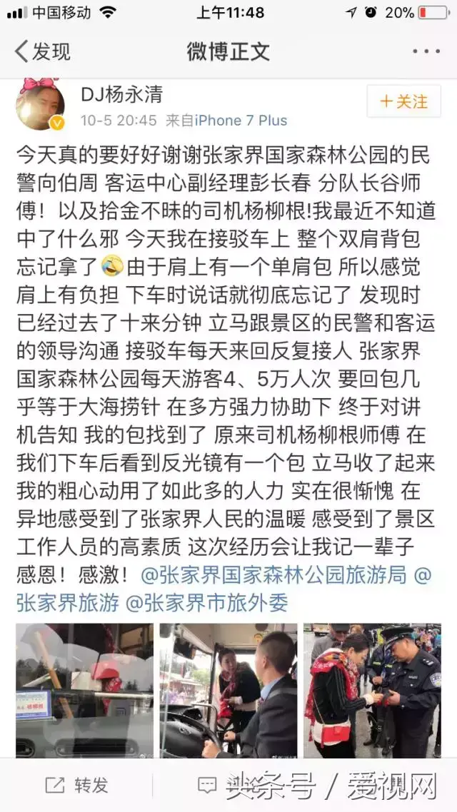 10月5日,新浪微博网友“DJ杨永清”发微博称,自己在张家界国家森林公园游玩时,不慎丢失随身的双肩包,经过景区工作人员多方协助寻找,最终幸运找回丢失的物品。