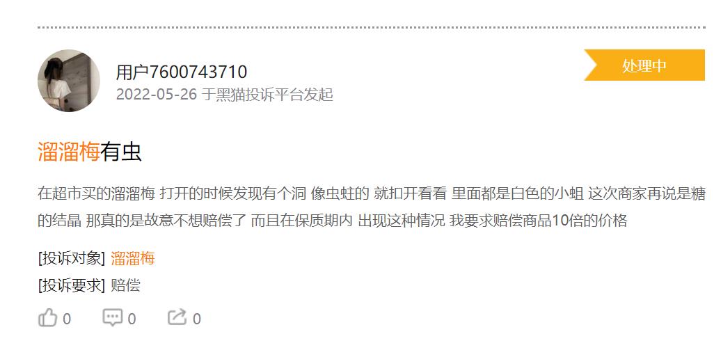 今年以来,溜溜梅的食品质量一直受到广泛关注。在黑猫投诉平台上,关于溜溜梅的质量投诉屡见不鲜,不断有消费者投诉在溜溜梅里吃出异物,甚至不乏有虫子、石子等异物。