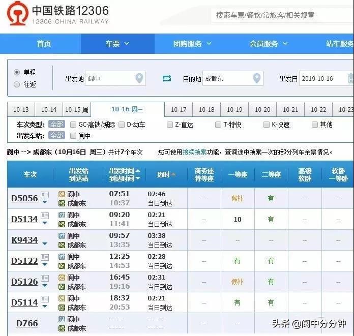 经过阆中市发改部门、阆中火车站的积极协调,在本轮铁路调图中,铁路部门充分考虑到阆中古城作为5A级景区的客流需求,增加了阆中至成都的车次。目前,在铁路官网可以查询到新的火车信息如下: