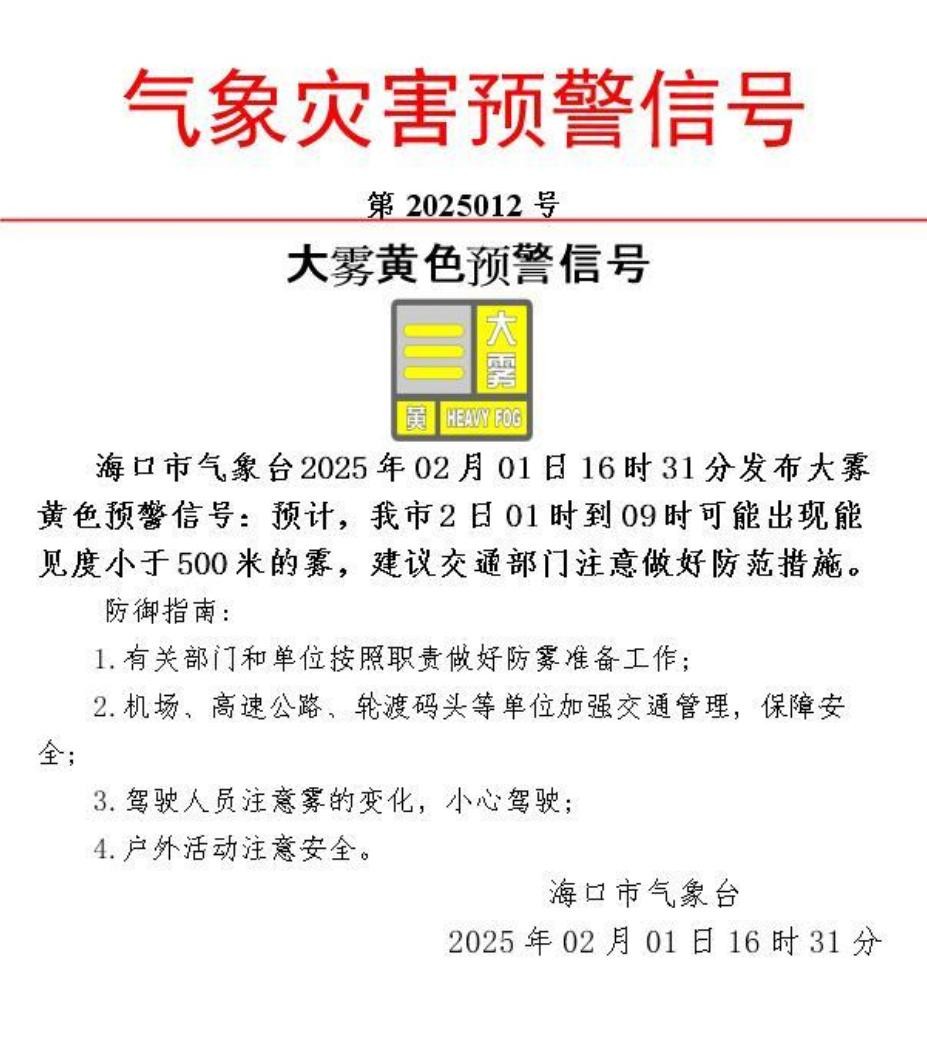 预计,海口市2月2日1时到9时可能出现能见度小于500米的雾,建议交通部门注意做好防范措施。