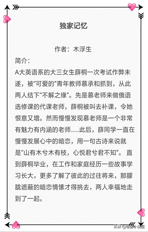 木浮生大大的文都写得都非常地细腻,总是能把一个简单故事刻画的那么生动形象。在她的笔下每个人物都能给人留下深刻的印象,一直以来是我非常喜欢的一个作者,下面是螃蟹整理了一些作者大大的其他文,希望亲们喜欢~~
