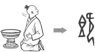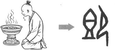 “即”的甲骨文是,一个盛放食物的器皿放在左边,旁边是跪坐着面向饭食的人形,好似迫不及待地要吃饭了,但还没有发生。“即”的本义就是“走近去用餐”。