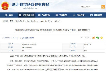【指定学校换发职业证件?湖北鄂州市住建局涉嫌滥用行政权力被纠正】“鄂州市捷创建设职业技术培训学校有限公司是目前我市唯一培训机构”,并要求换证学员注册信息……上述信息是湖北省鄂州市住房和城乡建设局在2020年8月下发的通知。近日,湖北省市场监管局对外披露鄂州市住房和城乡建设局滥用行政权力排除、限制竞争行为。